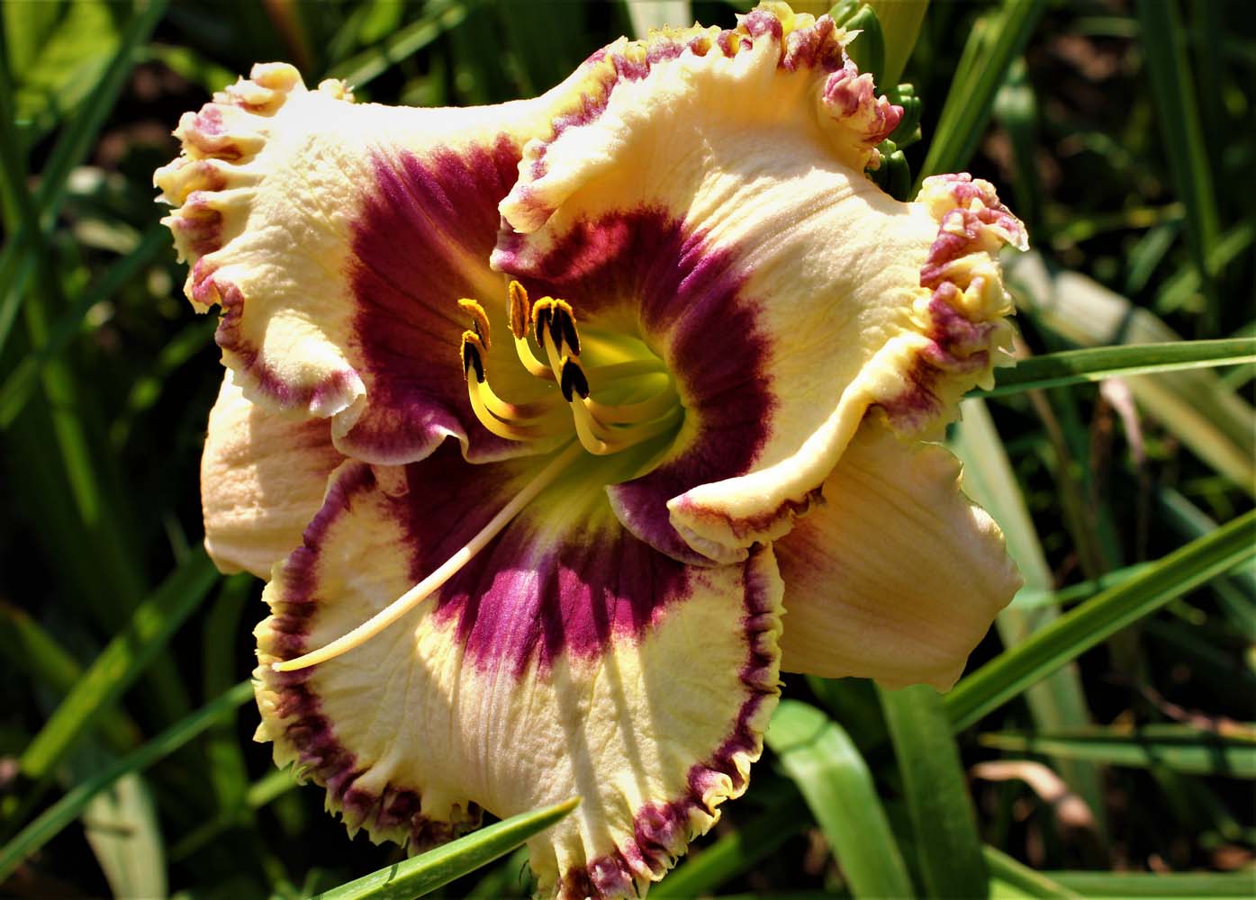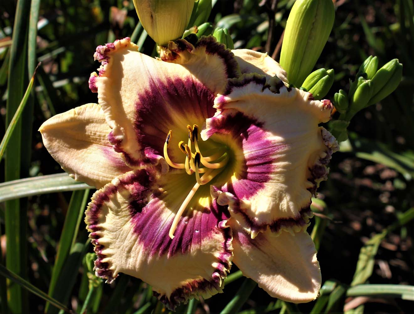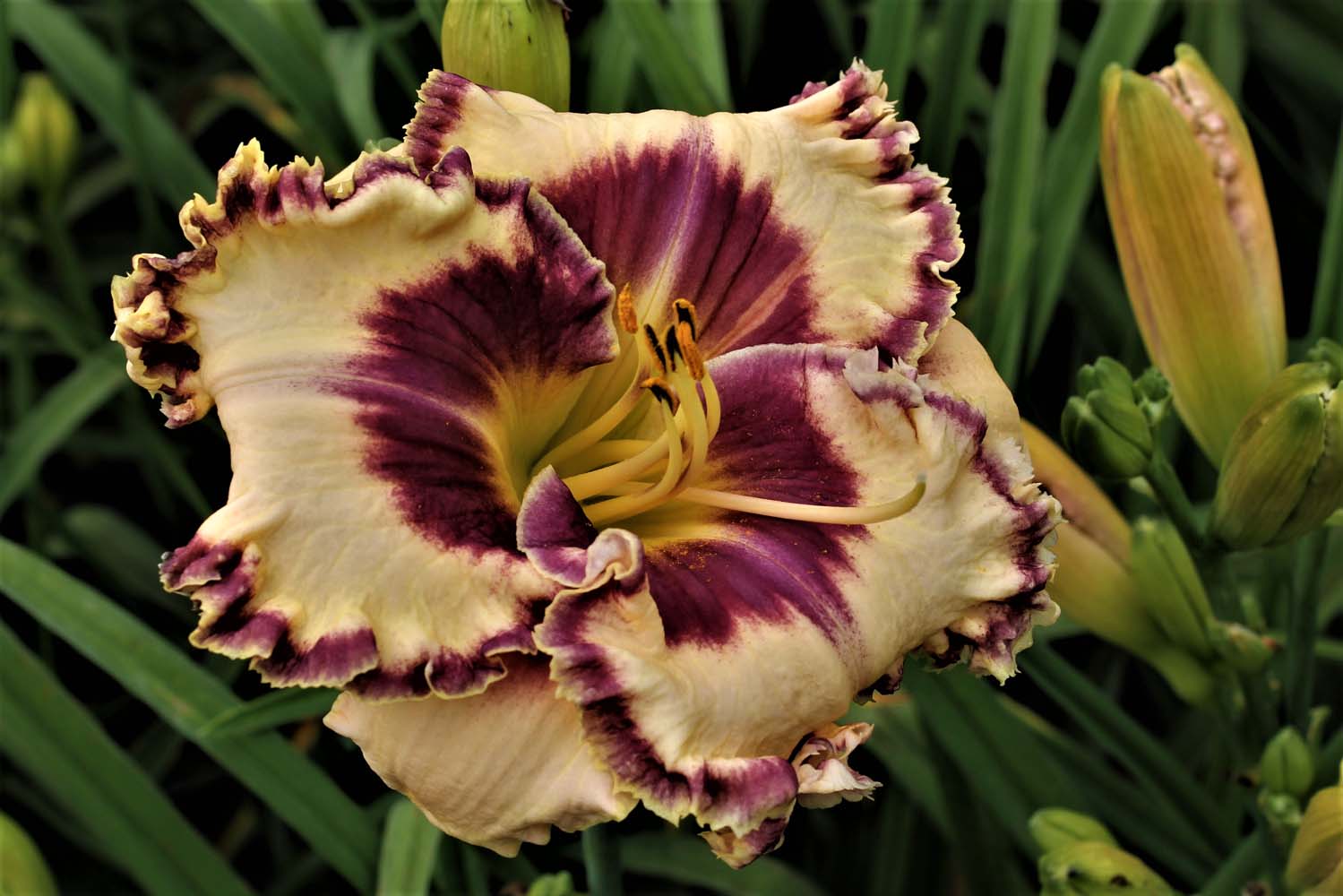 30” EM 5.5” Dor Tet Cream with purple eye and double edge of purple and cream. Three branches and 12 buds. It is a cross of Rollercoaster Rush by Sdlg 11-109. The colors resemble Rollercoaster Rush which is marginally hardy here in Wisconsin and nearly died out a couple of times. This selection appears to be hardier and has made it through our winters without any mulching. Reblooms heavily in mid-to late-September in central Wisconsin.