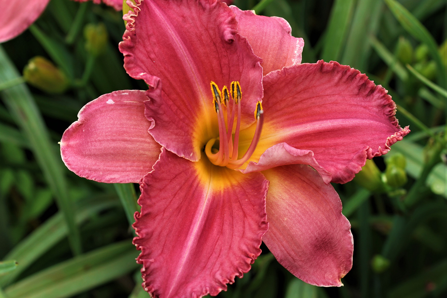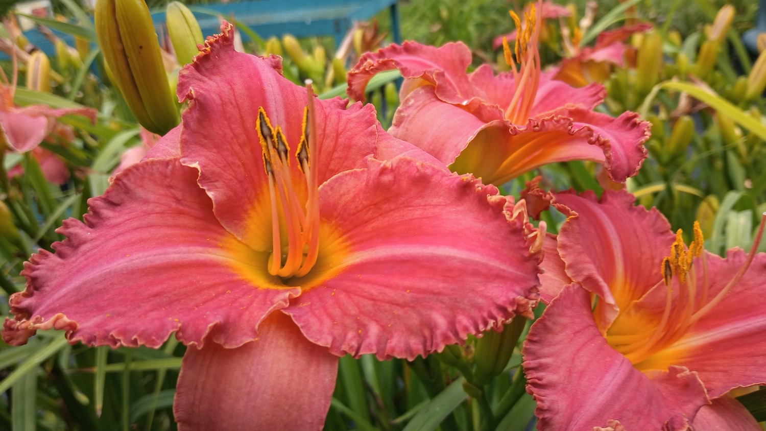 Apps 2021. 33” ML-L Re 5” Dor Tet Vibrant pink with light orange throat. 4 branches 18-20 buds. Sdlg. No.15-88 (Sdlg. 06-106 x ‘Shadow of the Wolf’). Flowering from late July all the way through August in Central Wisconsin. It has the good plant habits of ‘Shadow of the Wolf’ and a pink color not so common in the late season. Our short row of lined out plants remind us of butterflies and Dolly Parton’s song.