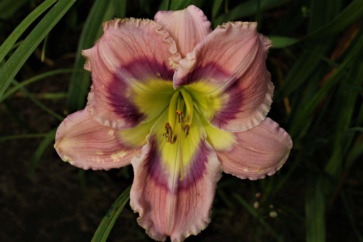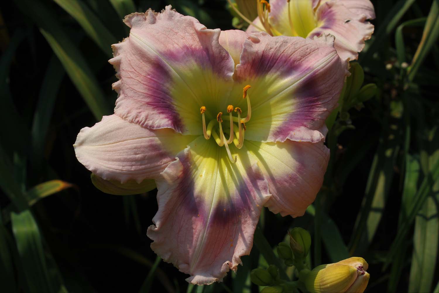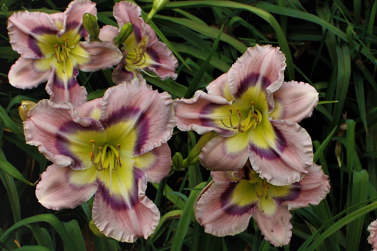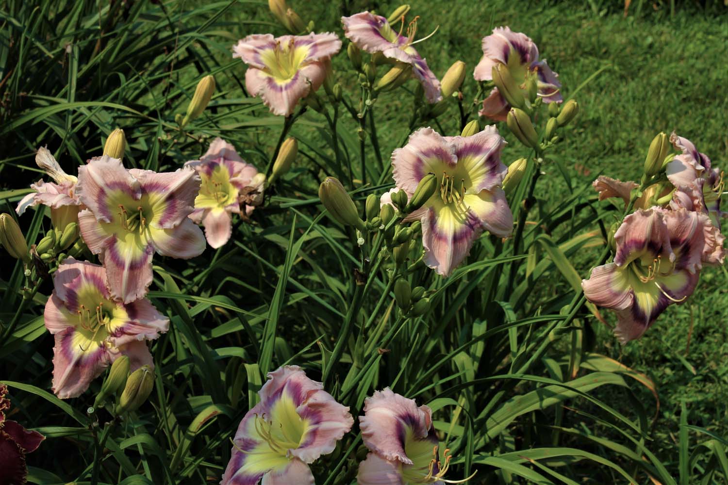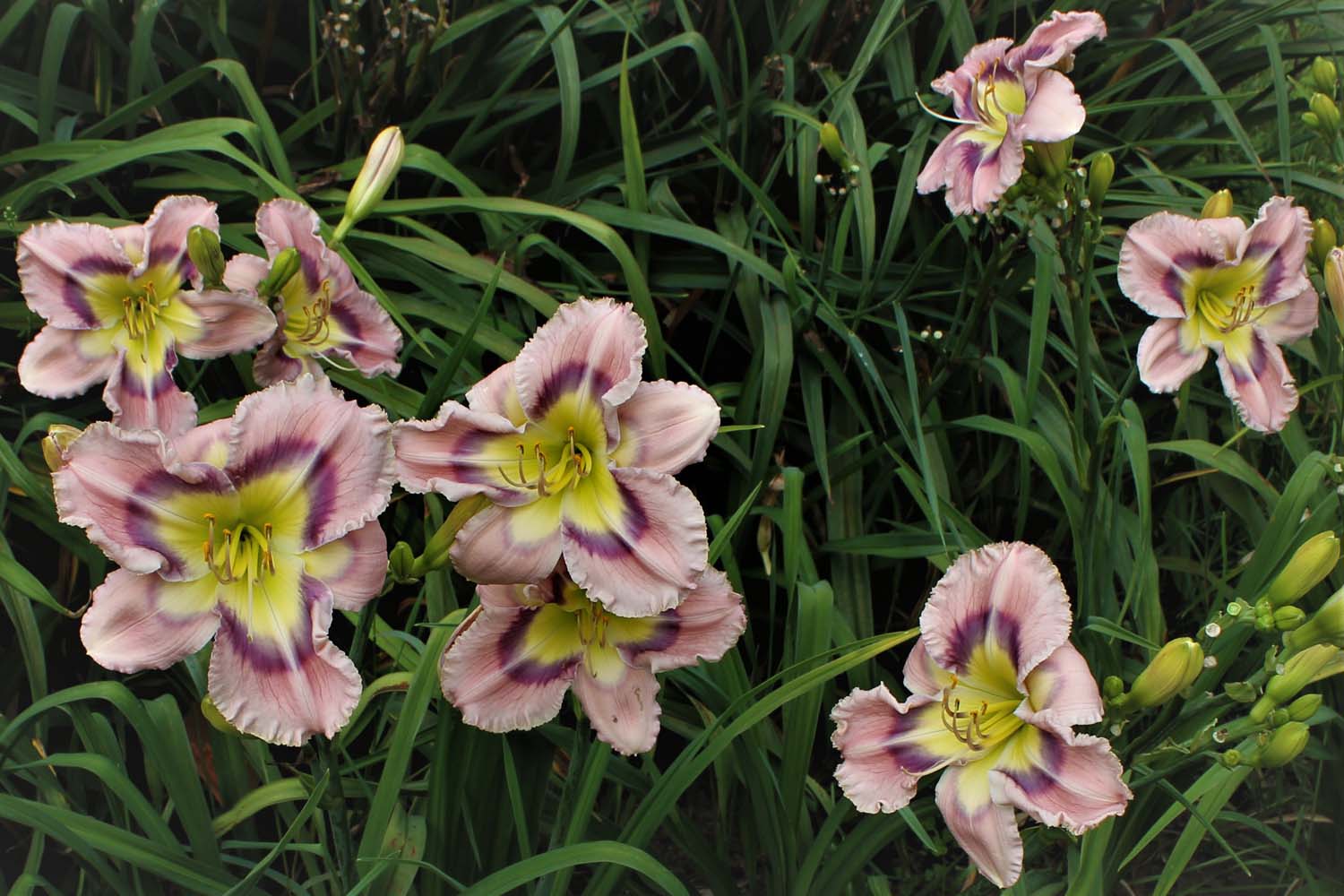 30” Dor Dip 5.5” Light lavender with blue-purple eye and large yellow-green throat. From a cross of Sdlg 08-65 by Beth Creveling. Five branches and 20 bud per scape. It displays stronger colors during cool mornings.