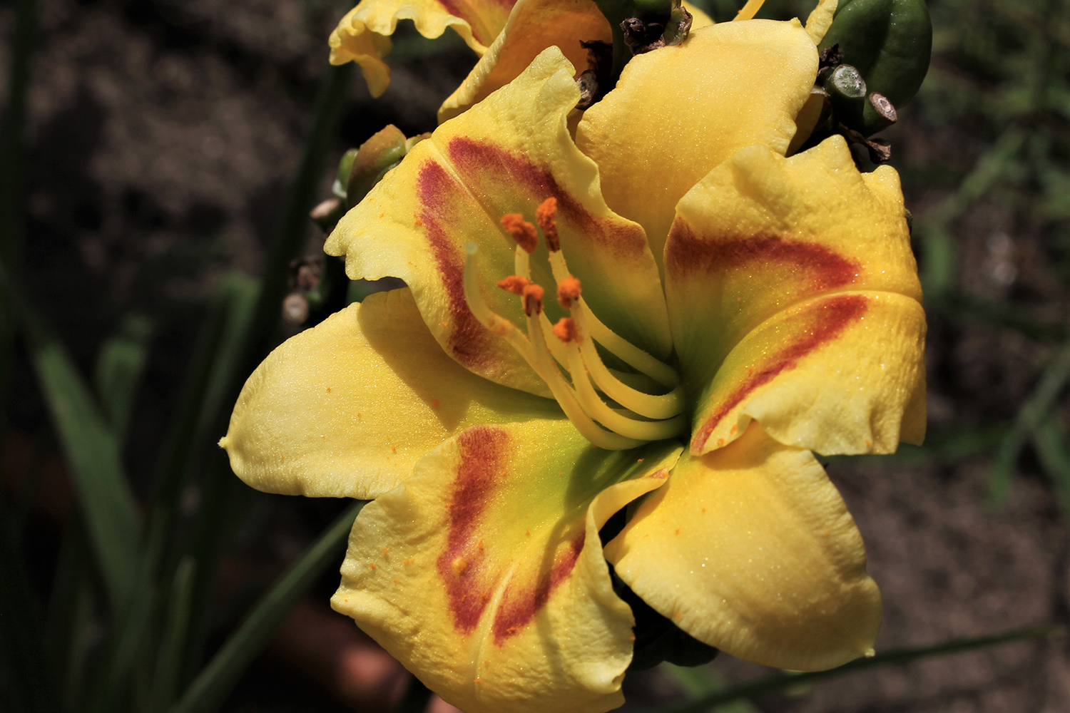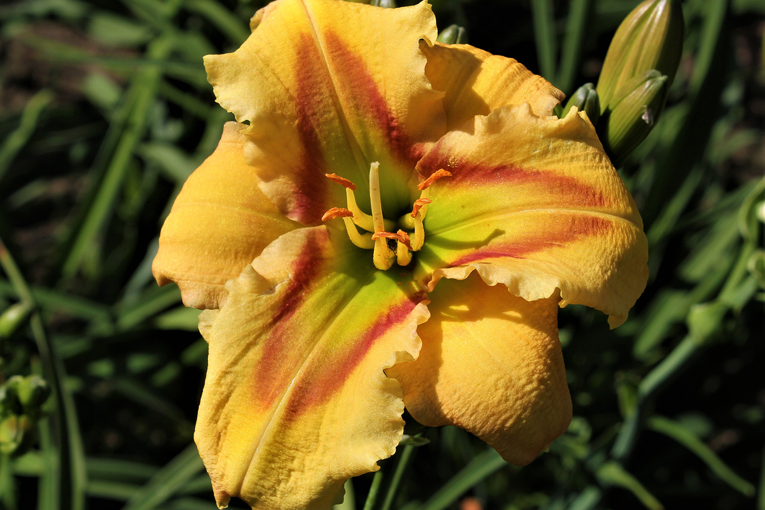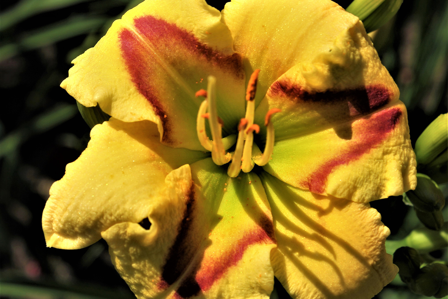 Yellow with triangular red band extending from the green throat up the petals